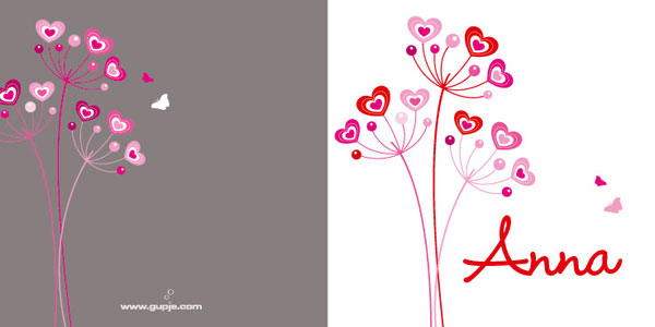 Fleurig geboortekaartje met blaasbloemen in de vorm van hartjes. De kleuren roze en rood zorgen dat het een warm kaartje is!