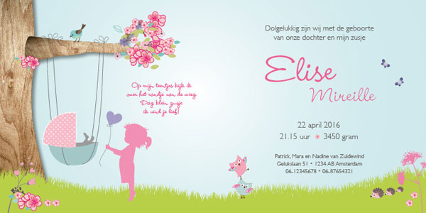 Origineel geboortekaartje voor jullie dochtertje. Aan de binnenkant staat een roze silhouetje van zusje. Ze kijkt op haar teentjes in het wiegje waar haar pasgeboren kleine zusje ligt. Is dit jullie eerste kindje dan kan het silhouetjes uiteraard weggelaten worden en het kan ook een broertje worden. De basiskleuren zijn pastel met groen.