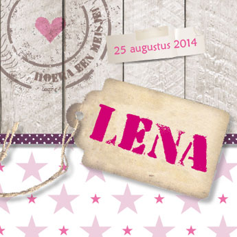 Stoer en lief geboortekaartje voor jullie dochtertje. Lief door het schattige labeltje waar de naam in het roze op kan en stoer door het gebruik van steigehout en stempels.