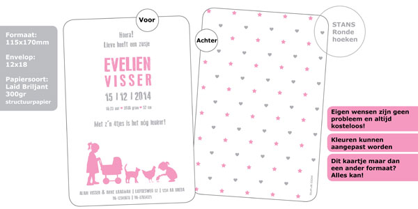 Dit geboortekaartje met roze silhouetjes van grote zus en silhouet zusje met diverse diertjes wordt gedrukt op prachtige stevige structuurpapier. Net zo mooi als drukken op karton of letterpress maar voor een leuke prijs! Extra mooi met ronde hoeken.