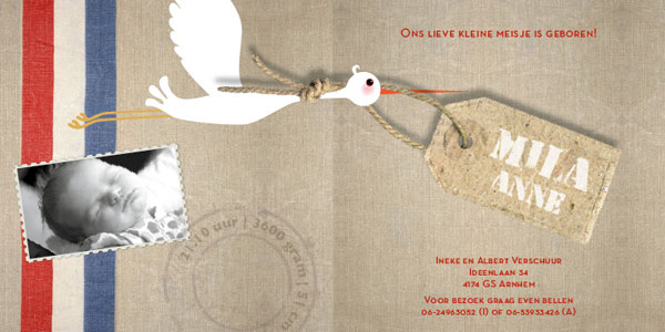 Rood-wit-blauw, ik hou van jou! Helemaal hip met de stempels en kraft label waar de naam in stempelletters op kan. Aan de binnenkant vliegt een ooienvaar met het label in zijn bek. Leuk met babyfoto van jullie pasgeboren gupje!
