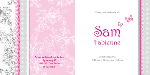 Alle geboortekaartjes kunnen naar wens worden aangepast. Denk aan broertje(s) en of zusjes(s) erbij, jullie huisdier, andere kleuren, mixen met andere kaartjes, ander lettertype, ander formaat. Alles is mogelijk en alle eigen wensen zijn altijd gratis. tijdens het bestellen kunnen eigen wensen worden ingevuld. Gupje maakt jullie kaartje binnen 3-5 werkdagen en mailt het kaartje naar jullie. Correcties kunnen dan altijd nog en zijn gratis.