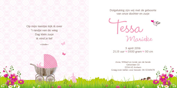 Origineel geboortekaartje met grote zus die de kinderwagen duwt. Uit de kinderwagen spartelen lieve babyvoetjes. Het roze matcht super mooi met het groene gras en de fuchsia bloemen. In het gras staat een konijntje te kijken. Dit kan ook een katje worden of jullie eigen eigen huisdier.