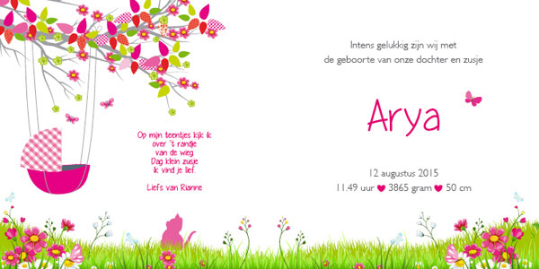 Wat een gaaf geboortekaartje is dit voor jullie dochtertje. Compleet met roze silhouetje van grote zus (of broertje indien gewenst). Echt een lente of zomers kaartje door de frisse kleuren roze, rood, fuchsia en lindegroen.