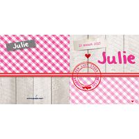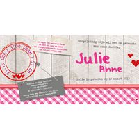 Geboortekaartje hout label roze stempels