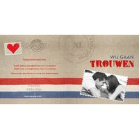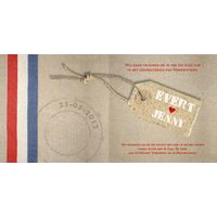 Super originele trouwkaart met strakke boom en lampjes. De grote A5 basiskaart is de algemene feestkaart en zowel voor daggasten als avondgasten. De langwerpige label voor de daggasten is opgebouwd met een tijdlijn, deze kan helemaal naar wens worden gemaakt (1,- per stuk icm de grote basiskaart). Je vouwt een stukje om de voorkant van de kaart. Dus je ziet een daggast tekst op de voorkant en achterop zie je de tijdlijn voor de daggasten.