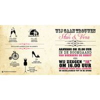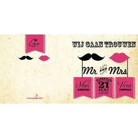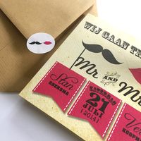 Hip en origineel trouwkaartje met icoontjes van snor en lip. De kleuren zijn grijzig linnen op de achtergrond, 'oud'groen, blauw en 'oud'roze/oranje. Aan de binnenkant staan icoontjes (altijd naar wens aanpasbaar!) voor dresscode, parkeren, feest en cadeautip.