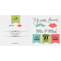 Trouwkaart met hippe postzak als achtergrond. Jullie eigen foto kan op de voorkant en in de stempel de trouwdatum. Aan de binnenkant is een mooi kartonnen label waarin jullie namen gezet kunnen worden. De achterkant is gefrankeerd met een liefdespostzegel.
