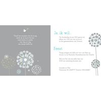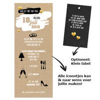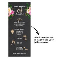 Trouwen jullie aan zee? Dan is dit het perfect strand trouwkaartje. Op de achtergrond is zand, strand en zee te zien en de icoontjes om feestonderdelen aan te geven zijn strak vormgegeven (er kan ook een BBQ bij). De tekst is mooi grafisch vormgegeven met diverse letetrtypes en groottes.