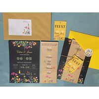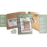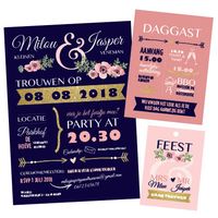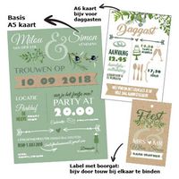 Originele trouwkaart met karton en bloemen. Leuke details met de wildflowers waardoor het extra gaaf is voor een buitenfeest bruiloft. De grote A5 basiskaart is de algemene feestkaart en zowel voor daggasten als avondgasten. De A6 kaart (daggasten) is opgebouwd met een tijdlijn, deze kan helemaal naar wens worden gemaakt (1,- per stuk icm de grote basiskaart). Super hip met label (1,- per stuk icm de grote basiskaart) die dmv boorgat en touw om de grote kaart gebonden kan worden. Icoontjes en illustraties kunnen gratis naar wens worden aangepast! Leuk met bijpassend adresetiket en sluitsticker erbij.